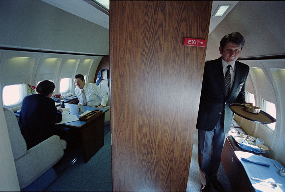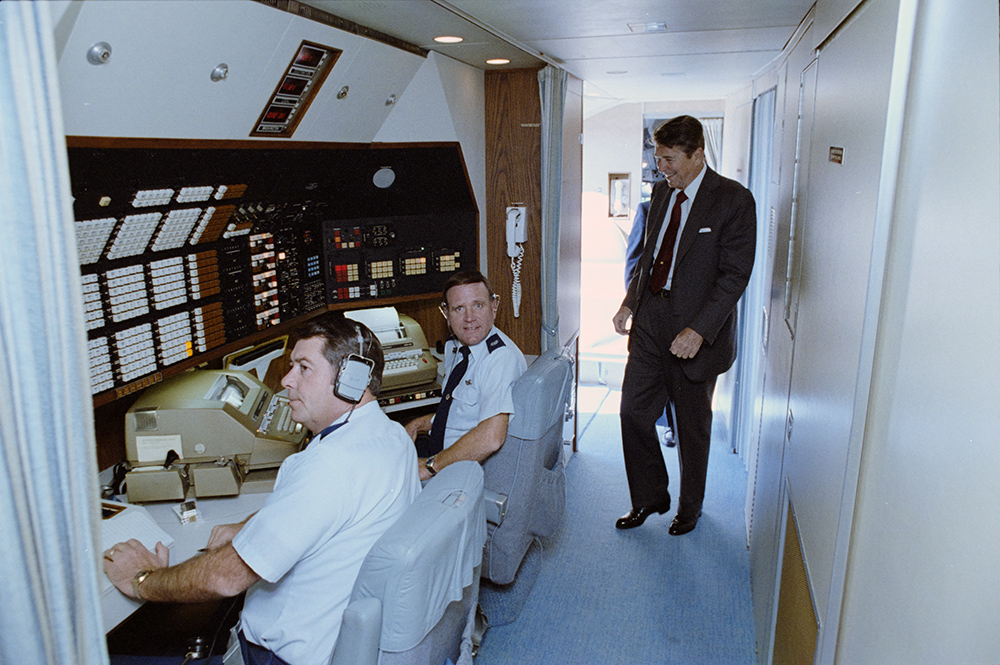 C10956-3, President Reagan walks by the Communications center aboard Air Force One. 10/26/1982.