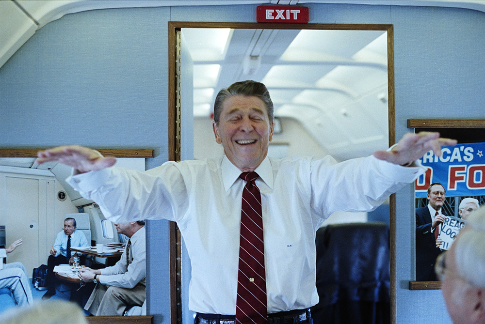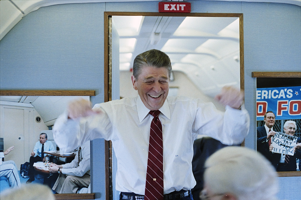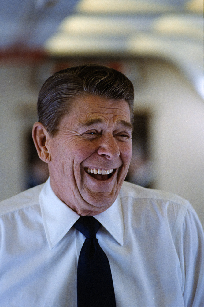 45637-16, President Reagan laughing aboard Air Force One on a trip to Belgium. 03/11/1988.