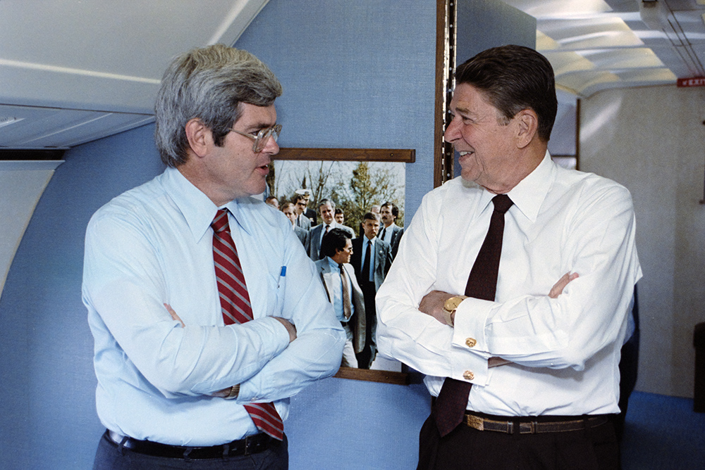 C16319-11, President Reagan talking with Congressman Newt Gingrich on a trip to Atlanta, Georgia. 08/01/1983.