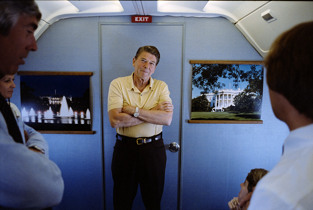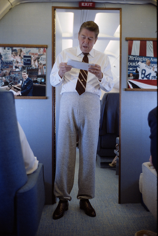 C24414-21A, President Reagan wearing sweatpants talking to staff aboard Air Force One on a trip to Iowa. 09/20/1984.