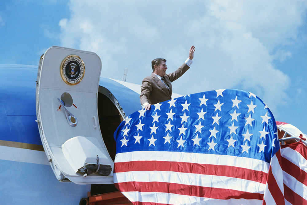 C36064-10, President Reagan waving from the doorway of Air Force One while departing from Alabama. 07/10/1986.