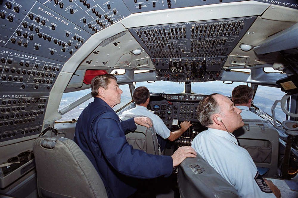 C6817-25, President Reagan sitting with the crew in the cockpit of Air Force One. 03/16/1982.