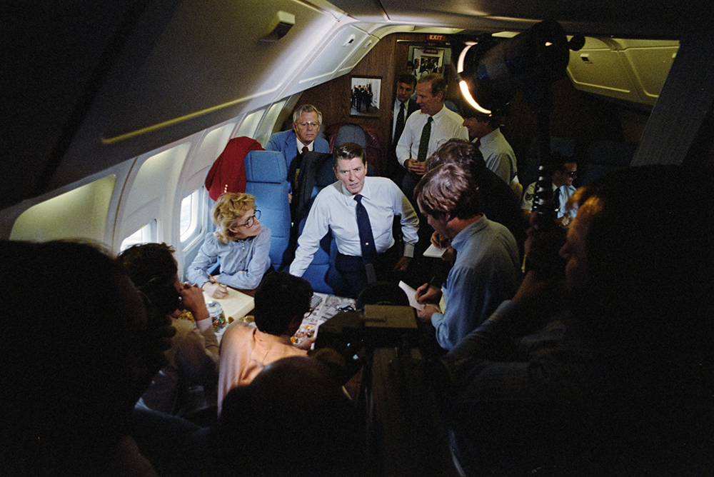 C7454-30, President Reagan talking to the press aboard Air Force One. 04/15/1982.