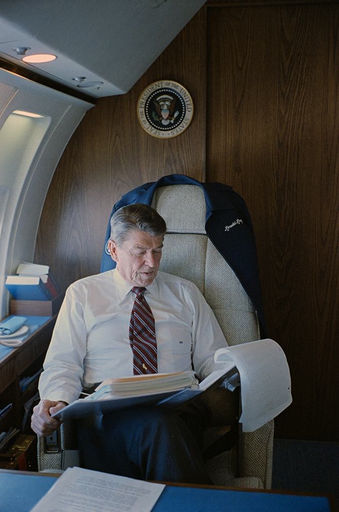 C40131-22A, President Reagan working aboard Air Force One during a trip to California. 04/09/1987.