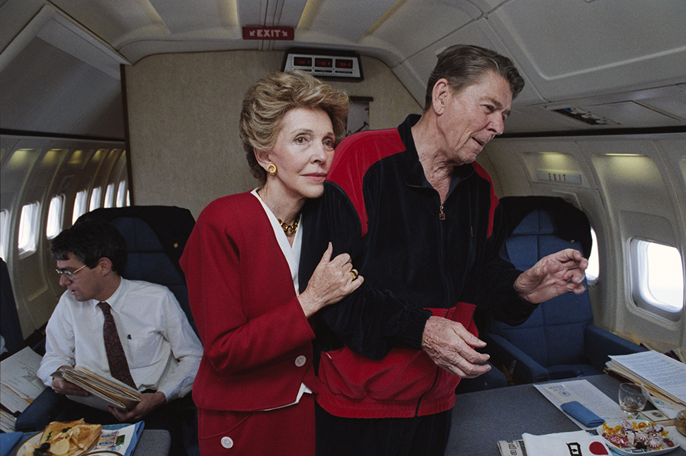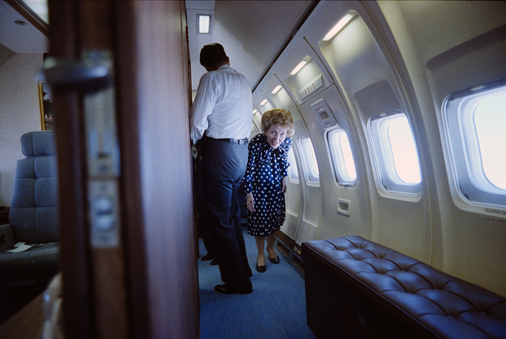 C8266-20, Nancy Reagan walking by President Reagan during a trip to France via Air Force One. 06/02/1982.