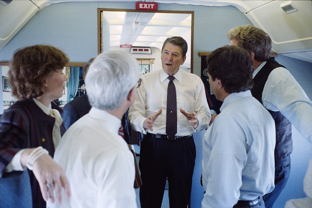 C36537-10, President Reagan talking to staff during a trip to Andrews Air Force Base with Pat Buchanan, Mark Peterson, Thomas Dawson, Jim Kuhn and Brooke Vosburgh. 08/12/1986.
