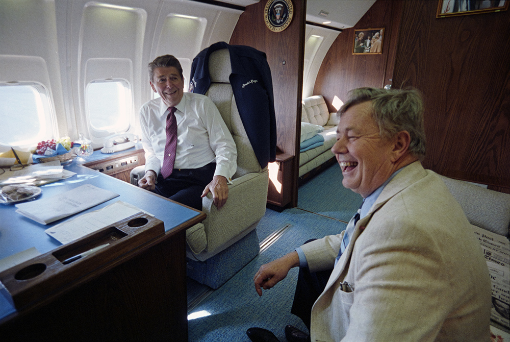 C25702-12, President Reagan talking to Stu Spencer during a trip aboard Air Force One to Rochester, New York. 11/01/1984.