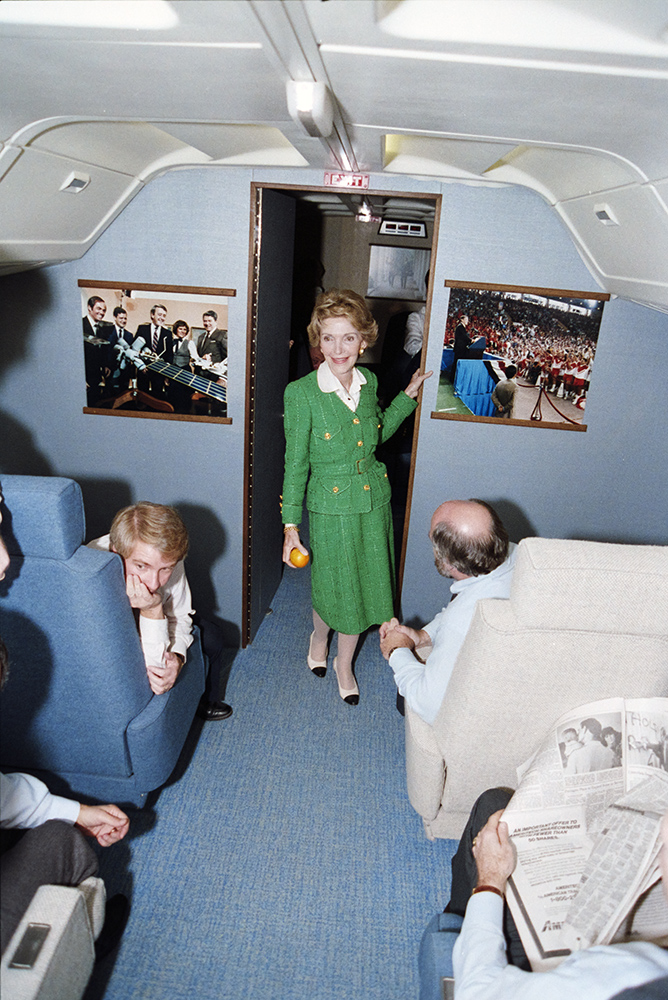C25844-22, Nancy Reagan rolling an orange down the aisle aboard Air Force One to celebrate the end of a California campaign trip. 11/05/1984.