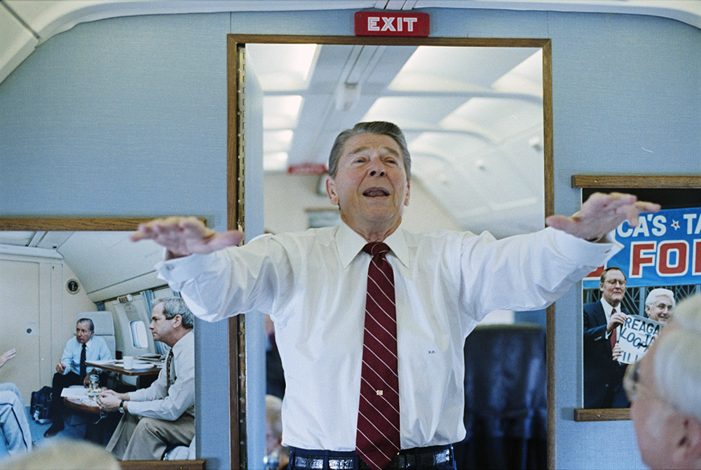 C31351-26, President Reagan telling a story during a trip to Illinois aboard Air Force One. 10/10/1985.