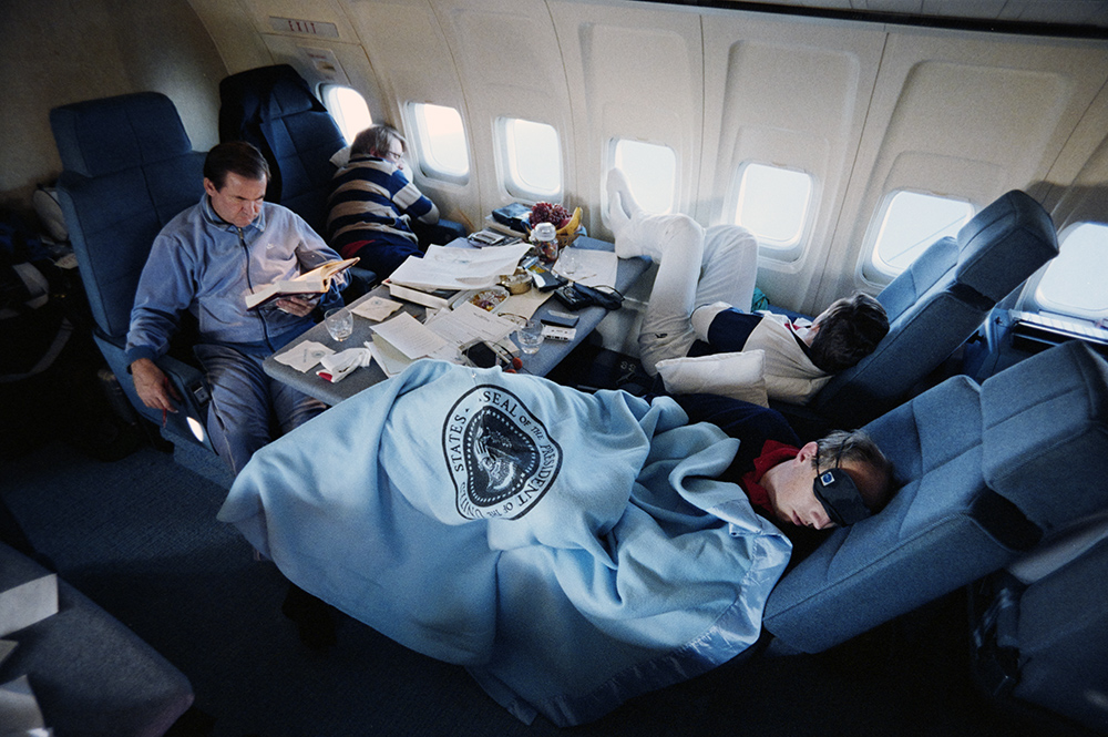 C775-9A, Ed Meese and William French Smith sleeping on Air Force One during trip to California. 02/19/1981.