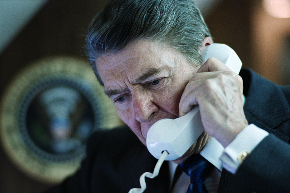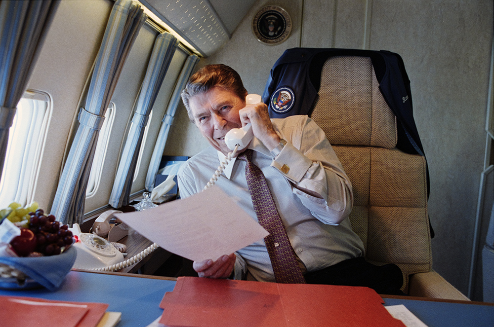 C22966-8, President Reagan talking on telephone aboard Air Force One during trip to Alabama. 07/04/1984.