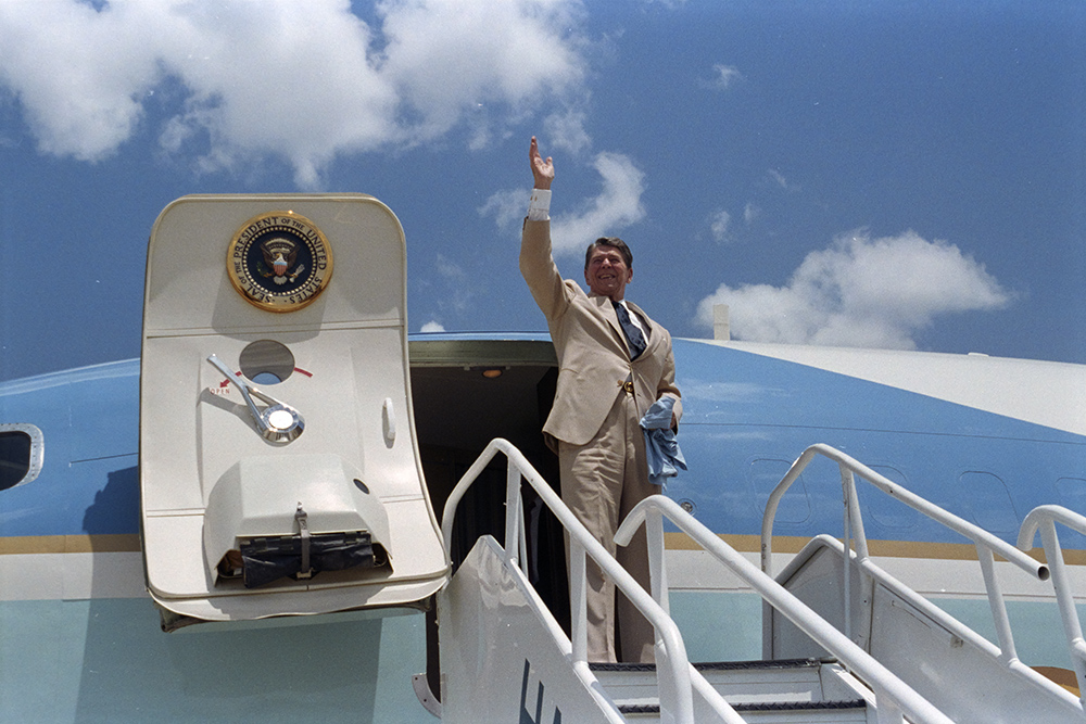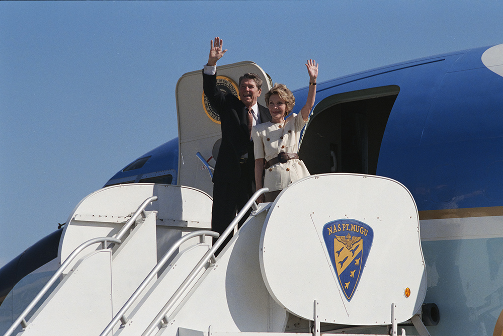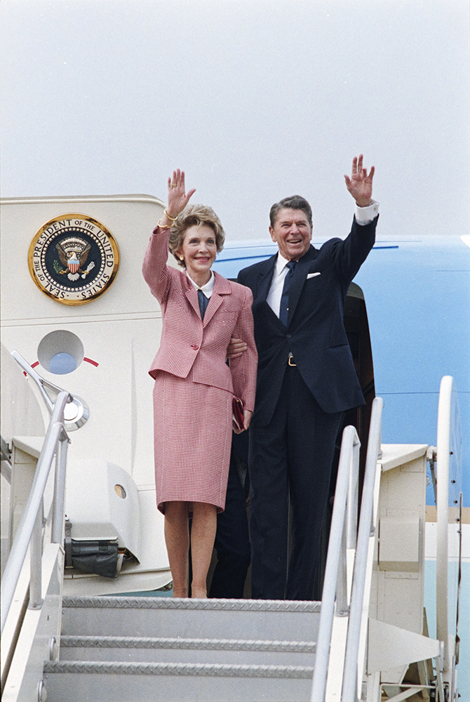 C48933-6, President Reagan and Nancy Reagan waving at their arrival via Air Force One at Point Mugu NAS in California 08/16/1988.