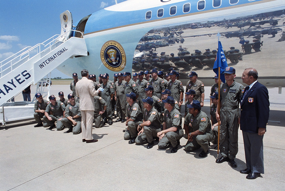 C36056-3, President Reagan speaking to U.S. Army precision helicopter team during his trip to Dothan Alabama at Dothan airport in front of Air Force One. 07/10/1986.