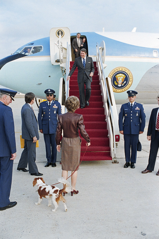 C37532-14A, President Reagan being greeted by Nancy Reagan and dog "Rex" upon his arrival via Air Force One at Andrews Air Force Base . 10/17/1986.