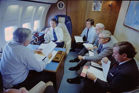 C31347-20, President Reagan meeting with staff in the lounge aboard Air Force One on a return trip to Andrews Air Force base. From left to right: Robert McFarlane, Ken Khachigian, President Reagan, Larry Speakes, Don Regan, Ben Elliott, Pat Buchanan. 10/10/1985.