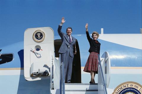 C34566-14A, President Reagan and Nancy Reagan waving during their departure via Air Force One for Indonesia at Anderson Air Force Base in Guam. 05/05/1986.