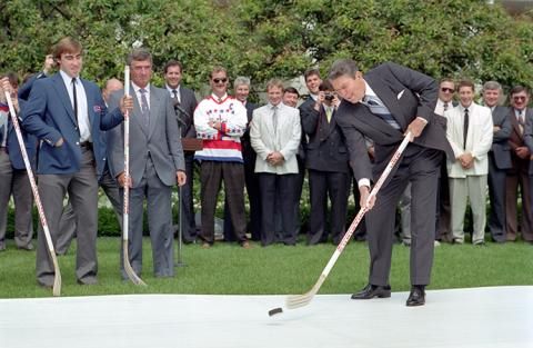 C42691-9A, President Reagan hitting a hockey puck while greeting members of the United States Olympic Hockey Team and the Washington Capitals professional hockey team in the Rose Garden. 09/24/1987.