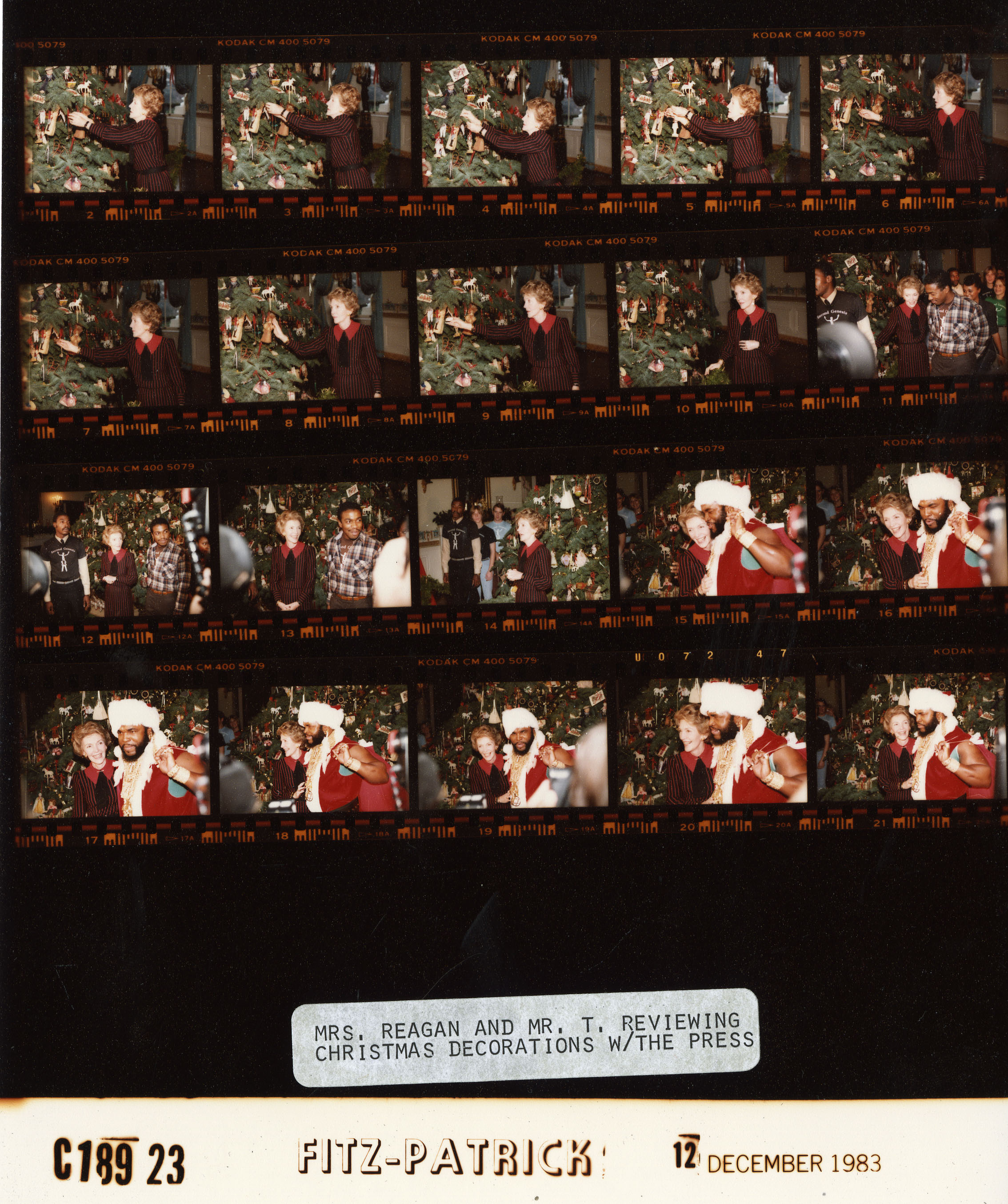 Nancy Reagan and Mr. T (Santa Claus) reviewing Christmas decorations with press