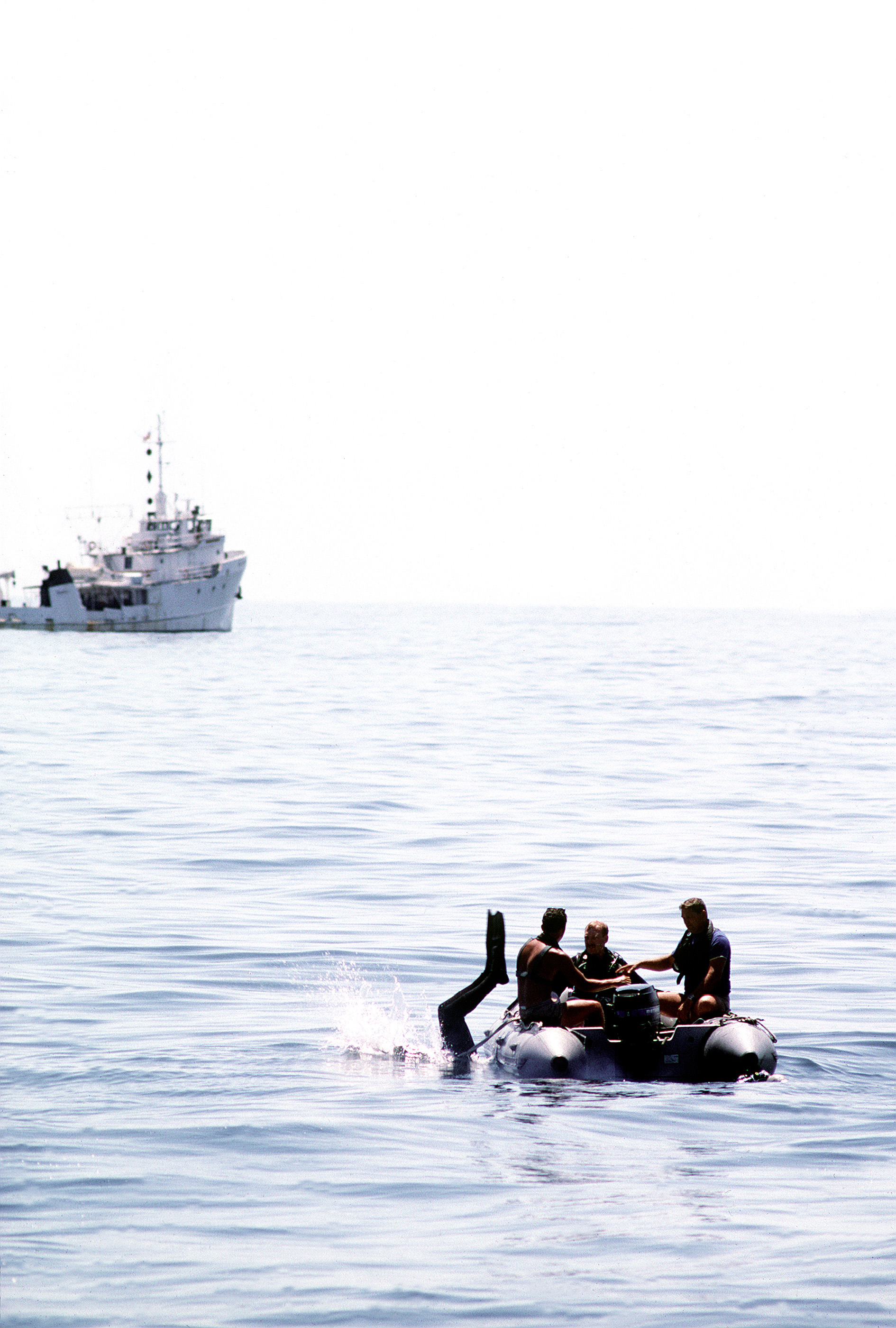 A diver goes overboard from an inflatable dinghy during salvage operations for the space shuttle orbiter Challenger. In the background is the salvage ship USS PRESERVER (...Show moreA diver goes overboard from an inflatable dinghy during salvage operations for the space shuttle orbiter Challenger. In the background is the salvage ship USS PRESERVER (ARS-8). 01/01/1986. NAID: 6421637. Show less330-CFD-DN-ST-87-02414