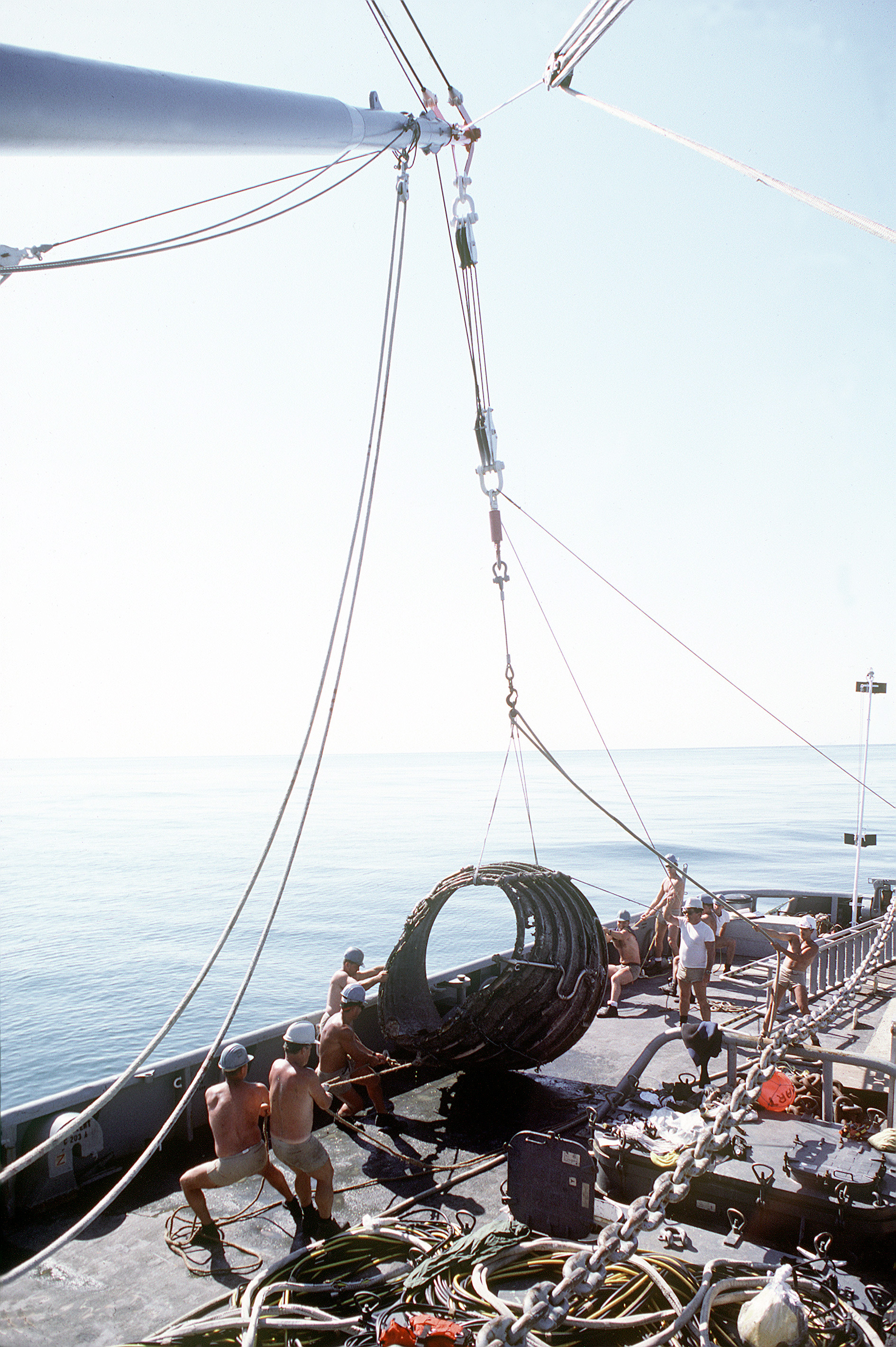 Crewmen use a crane to lift a piece of a rocket engine aboard the salvage ship USS PRESERVER (ARS-8) during the salvage operation for the Space Shuttle orbiter Challenger...Show moreCrewmen use a crane to lift a piece of a rocket engine aboard the salvage ship USS PRESERVER (ARS-8) during the salvage operation for the Space Shuttle orbiter Challenger. 01/01/1986. NAID: 6421641 Show less330-CFD-DN-STT-87-02418