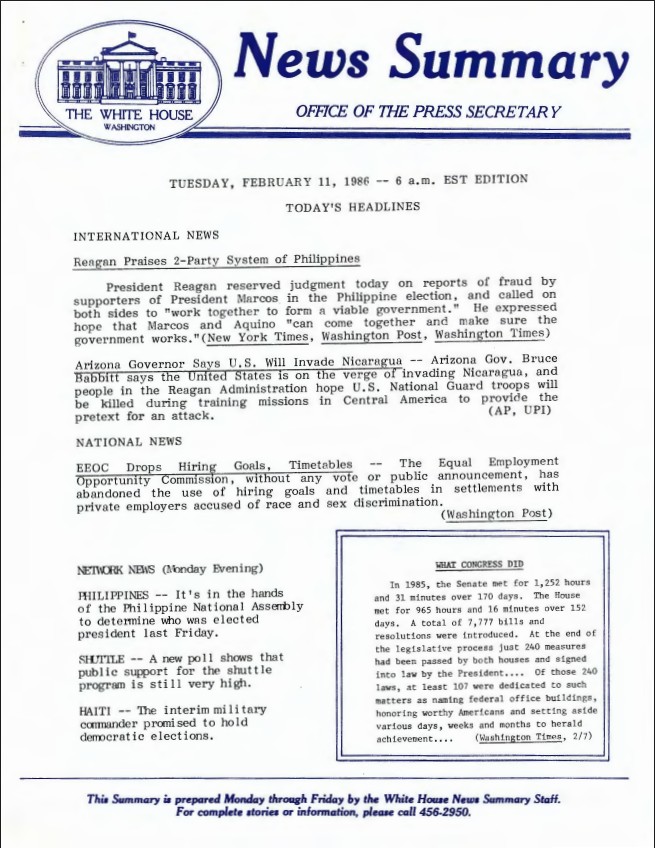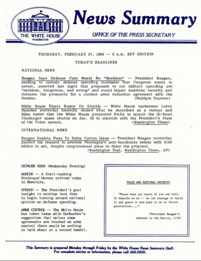 Page 1, News Summary Office of the Press Secretary Thursday, February 27, 1986 – 6 a.m. EST Edition. News Summary Office, White House: News Summaries SERIES II: WHITE HO...Show morePage 1, News Summary Office of the Press Secretary Thursday, February 27, 1986 – 6 a.m. EST Edition. News Summary Office, White House: News Summaries SERIES II: WHITE HOUSE NEWS SUMMARY FINALS. Box 386. Folder 02/11/1986. Show less