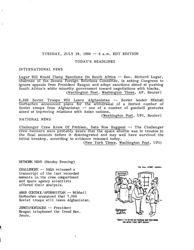 Page 1, Tuesday, July 29, 1986 – 6 a.m. EDT Edition News Summary Office, White House: News Summaries SERIES II: WHITE HOUSE NEWS SUMMARY FINALS. Box 389. Folder 07/29/198...Show morePage 1, Tuesday, July 29, 1986 – 6 a.m. EDT Edition News Summary Office, White House: News Summaries SERIES II: WHITE HOUSE NEWS SUMMARY FINALS. Box 389. Folder 07/29/1986. Show less