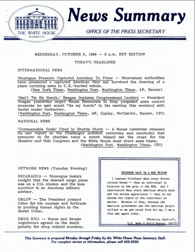 Page 1, News Summary Office of the Press Secretary Wednesday, October 8, 1986 – 6 a.m. EDT Edition News Summary Office, White House: News Summaries SERIES II: WHITE HOUSE...Show morePage 1, News Summary Office of the Press Secretary Wednesday, October 8, 1986 – 6 a.m. EDT Edition News Summary Office, White House: News Summaries SERIES II: WHITE HOUSE NEWS SUMMARY FINALS. Box 391. Folder 10/08/1986. Show less