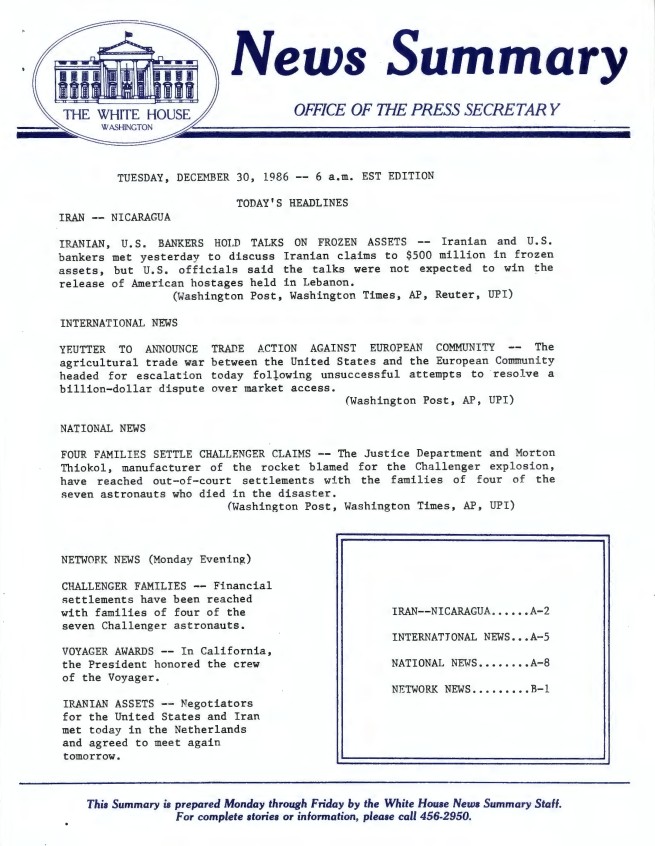 Page 1, News Summary Office of the Press Secretary Tuesday, December 30, 1986 – 6 a.m. EST Edition News Summary Office, White House News Summaries SERIES II: WHITE HOUSE ...Show morePage 1, News Summary Office of the Press Secretary Tuesday, December 30, 1986 – 6 a.m. EST Edition News Summary Office, White House News Summaries SERIES II: WHITE HOUSE NEWS SUMMARY FINALS. Box 392. Folder 12/30/1986. Show less