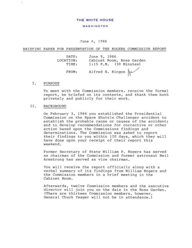Page 1, Briefing Paper for Presentation of the Rogers Commission Report Date: June 9, 1986. President, Office of the: Presidential Briefing Papers: Records. Box 70. Folde...Show morePage 1, Briefing Paper for Presentation of the Rogers Commission Report Date: June 9, 1986. President, Office of the: Presidential Briefing Papers: Records. Box 70. Folder 06/09/1986 (case file 419809). Show less