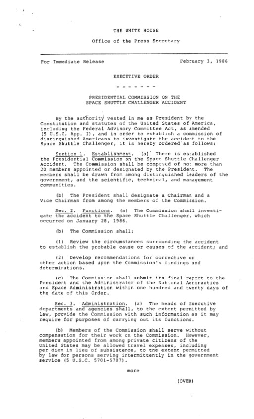 Page 1, Executive Order Presidential Commission on the Space Shuttle Challenger Accident February 3, 1986. Press Secretary, Office of the: Press Releases and Briefings: R...Show morePage 1, Executive Order Presidential Commission on the Space Shuttle Challenger Accident February 3, 1986. Press Secretary, Office of the: Press Releases and Briefings: Records. Box 121-Press Releases. Box121. 02/03/1986 #9700 . Show less