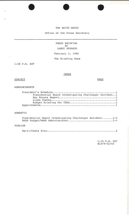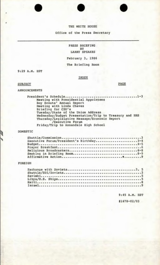 Index, Press Briefing By Larry Speakes 02/03/1986 The Briefing Room 1:28 P.M. EST #1679 Press Secretary, Office of the: Press Releases and Press Briefings: Records SERIES...Show moreIndex, Press Briefing By Larry Speakes 02/03/1986 The Briefing Room 1:28 P.M. EST #1679 Press Secretary, Office of the: Press Releases and Press Briefings: Records SERIES II: PRESS BRIEFINGS. Box 42. Folder: 02/03/1986 (#1679A). Show less