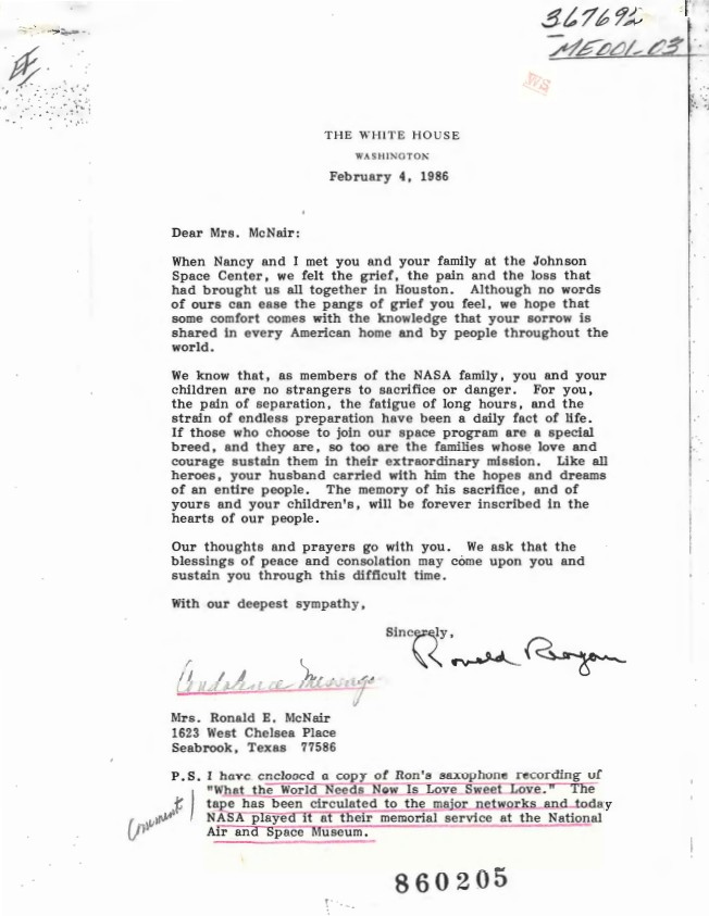 Letter, From: Ronald Reagan To: Mrs. Ronald E. McNair dated: 02/04/1986 WHORM Subject File ME001-03 (Messages: Messages, Presidential: Sympathy – Condolences). Case File ...Show moreLetter, From: Ronald Reagan To: Mrs. Ronald E. McNair dated: 02/04/1986 WHORM Subject File ME001-03 (Messages: Messages, Presidential: Sympathy – Condolences). Case File 367692. Show less