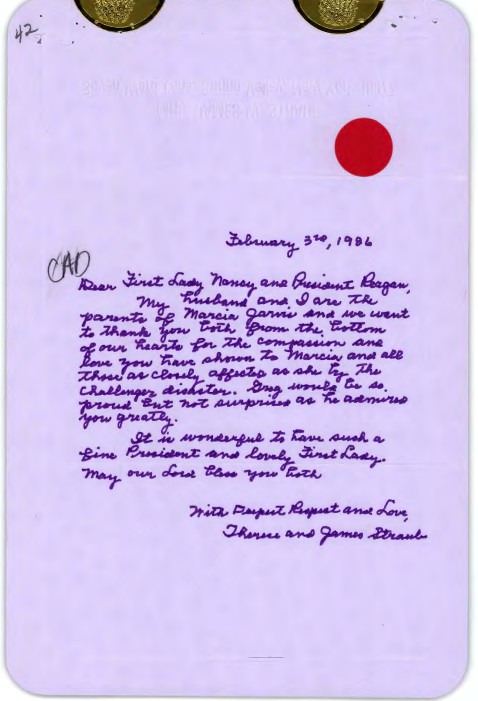 Letter, From: Theresa and James Straub To: First Lady Nancy and President Reagan dated 02/03/1986 WHORM Subject File PR005-01 (Public Relations: Autographs – Photographs:...Show moreLetter, From: Theresa and James Straub To: First Lady Nancy and President Reagan dated 02/03/1986 WHORM Subject File PR005-01 (Public Relations: Autographs – Photographs: Autograph granted, Presidential). Box 72. Case File 395321. Show less