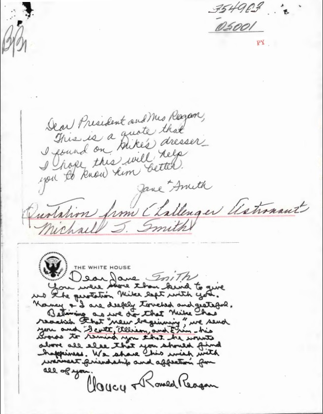 Letter, From: Jane Smith To: President and Mrs. Reagan and From: Nancy and Ronald Reagan To: Jane Smith WHORM Subject File OS001 (Outer Space: Space Flight). Box 12. Case...Show moreLetter, From: Jane Smith To: President and Mrs. Reagan and From: Nancy and Ronald Reagan To: Jane Smith WHORM Subject File OS001 (Outer Space: Space Flight). Box 12. Case File 354903. Show less