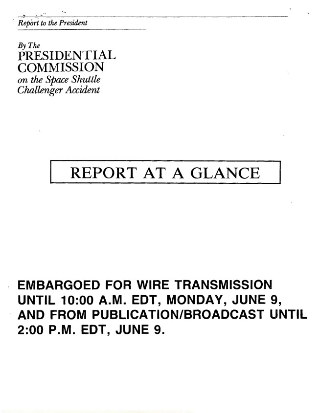 Report to the President by the Presidential Commission on the Space Shuttle Challenger Accident: Report At A Glance WHORM Subject File OS001 (Outer Space: Space Flight). ...Show moreReport to the President by the Presidential Commission on the Space Shuttle Challenger Accident: Report At A Glance WHORM Subject File OS001 (Outer Space: Space Flight). Box 13. Case File 408068. Show less