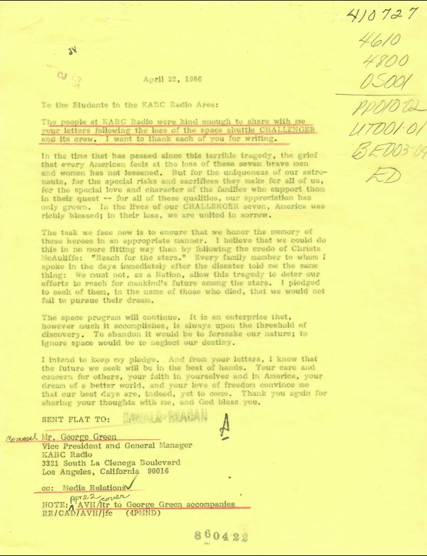 Letter, From: Ronald Reagan To: The Students in the KABC Radio Area dated 04/22/1986 WHORM Subject File OS001 (Outer Space: Space Flight). Box 13. Case File 410727.
