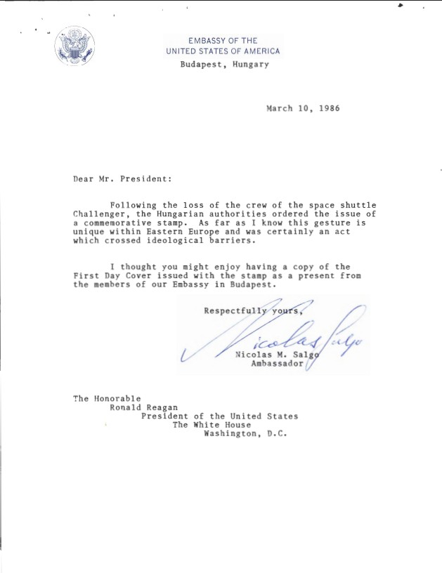 Letter, From: Nicolas M. Salgo, Ambassador To: The Honorable Ronald Reagan Dated: 03/10/1986 WHORM Subject File OS001 (Outer Space: Space Flight). Box 14. Case File 4323...Show moreLetter, From: Nicolas M. Salgo, Ambassador To: The Honorable Ronald Reagan Dated: 03/10/1986 WHORM Subject File OS001 (Outer Space: Space Flight). Box 14. Case File 432389. Show less