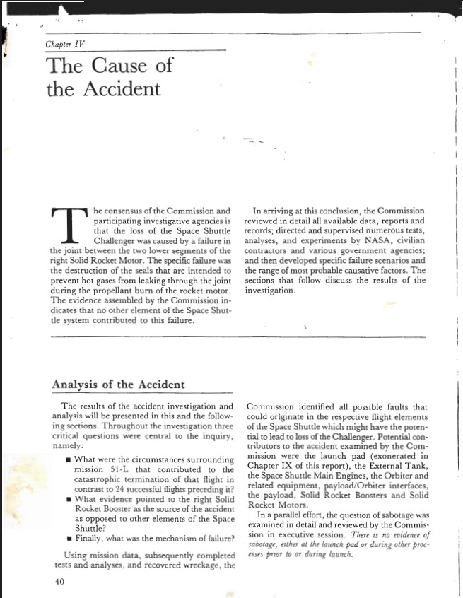 Page 40, Chapter IV the Cause of the Accident of the Report of the Presidential Commission on the Space Shuttle Challenger Accident WHORM Subject File OS001 (Outer Space:...Show morePage 40, Chapter IV the Cause of the Accident of the Report of the Presidential Commission on the Space Shuttle Challenger Accident WHORM Subject File OS001 (Outer Space: Space Flight). Box 15. Case File 460739. Show less