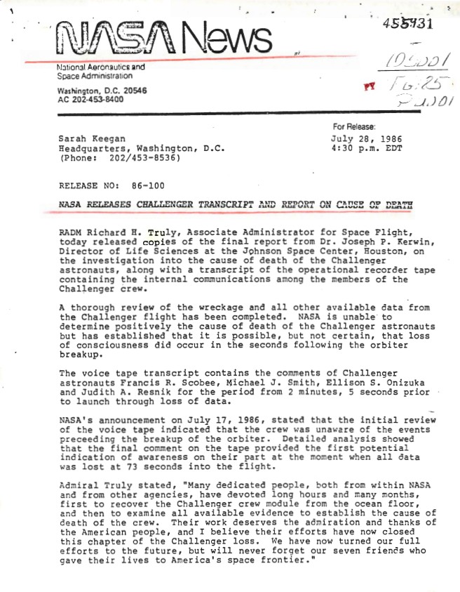 NASA News For Release: July 28, 1986 4:30 p.m. EDT RELEASE NO: 86-100 WHORM Subject File OS001 (Outer Space: Space Flight). Box 15. Case File 455931.