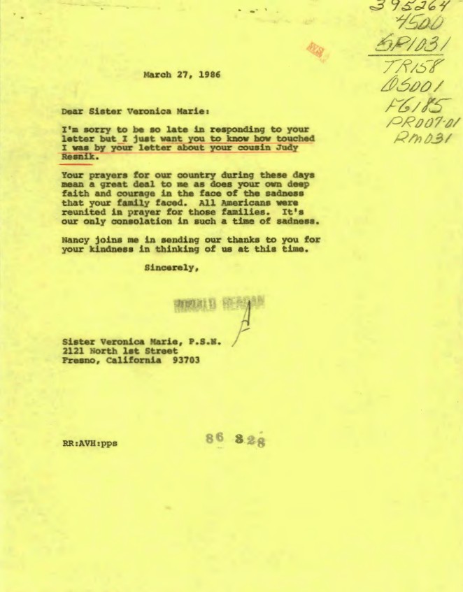 Letter, From: Ronald Reagan To: Sister Veronica Marie, P.S.N. dated 03/27/1986 WHORM Subject File SP1031 (Speeches: NASA Memorial Service, Challenger, Houston, TX, 01/31/...Show moreLetter, From: Ronald Reagan To: Sister Veronica Marie, P.S.N. dated 03/27/1986 WHORM Subject File SP1031 (Speeches: NASA Memorial Service, Challenger, Houston, TX, 01/31/986). Box 280. Case File 395264 Show less