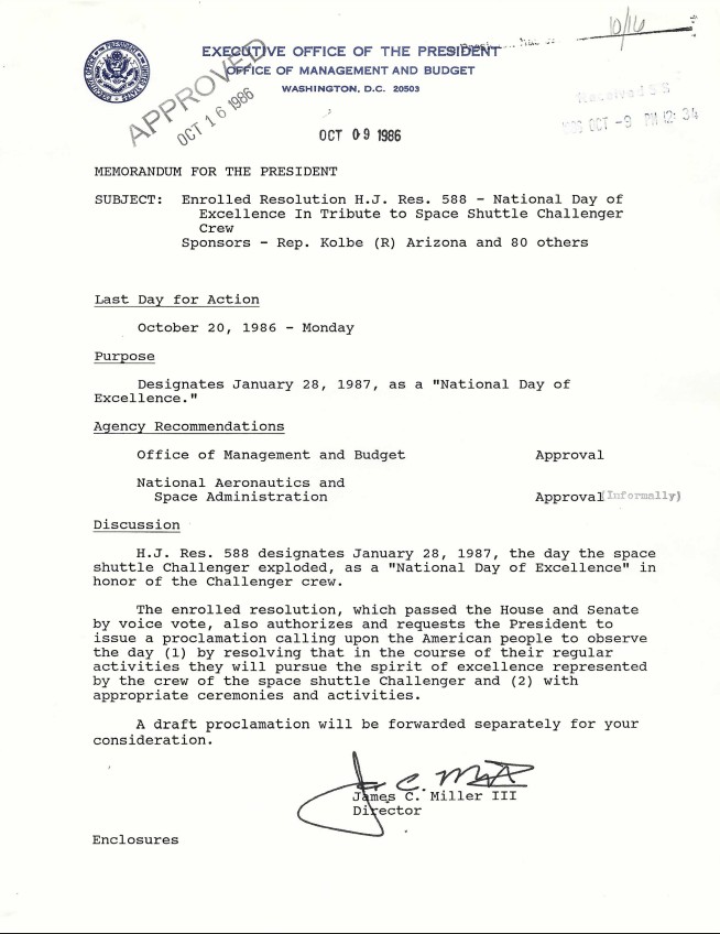 Memorandum for the President From: James C. Miller III Subject: Enrolled Resolution H.J. Res. 588 – National Day of Excellence In Tribute to Space Shuttle Challenger Crew...Show moreMemorandum for the President From: James C. Miller III Subject: Enrolled Resolution H.J. Res. 588 – National Day of Excellence In Tribute to Space Shuttle Challenger Crew Executive Clerk, Office of the: Records. Box 75. Folder 10/16/1986 H.J.R. 588 Show less