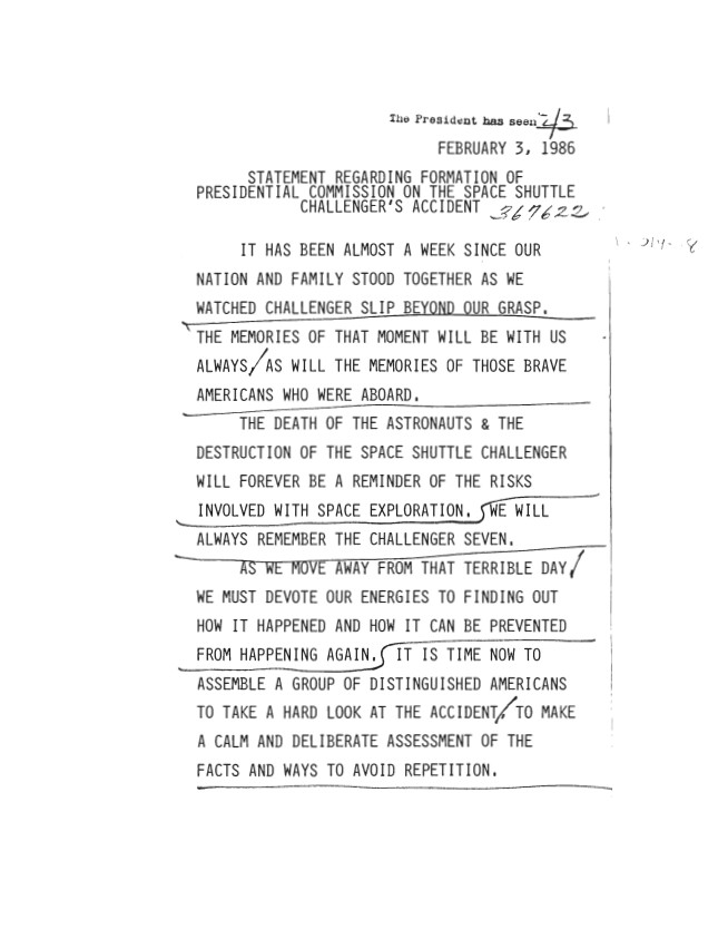 Page 1, Statement Regarding Formation of Presidential Commission on the Space Shuttle Challenger’s Accident 02/03/1986 WHORMt: Presidential Writing File, 1981-1989 (COPY ...Show morePage 1, Statement Regarding Formation of Presidential Commission on the Space Shuttle Challenger’s Accident 02/03/1986 WHORMt: Presidential Writing File, 1981-1989 (COPY SET): Speeches. Box 22. Folder 422 (02/01/1986-02/03/1986). Show less