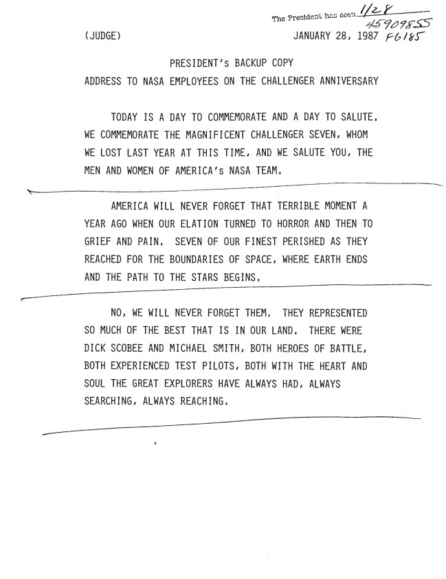 Page 1, President’s Backup Copy Address To NASA Employees On The Challenger Anniversary 01/28/1987 459098SS FG185 WHORM: Presidential Handwriting File: Speeches. Box 26. ...Show morePage 1, President’s Backup Copy Address To NASA Employees On The Challenger Anniversary 01/28/1987 459098SS FG185 WHORM: Presidential Handwriting File: Speeches. Box 26. Folder 515 (01/28/1987-02/05/1987). Show less