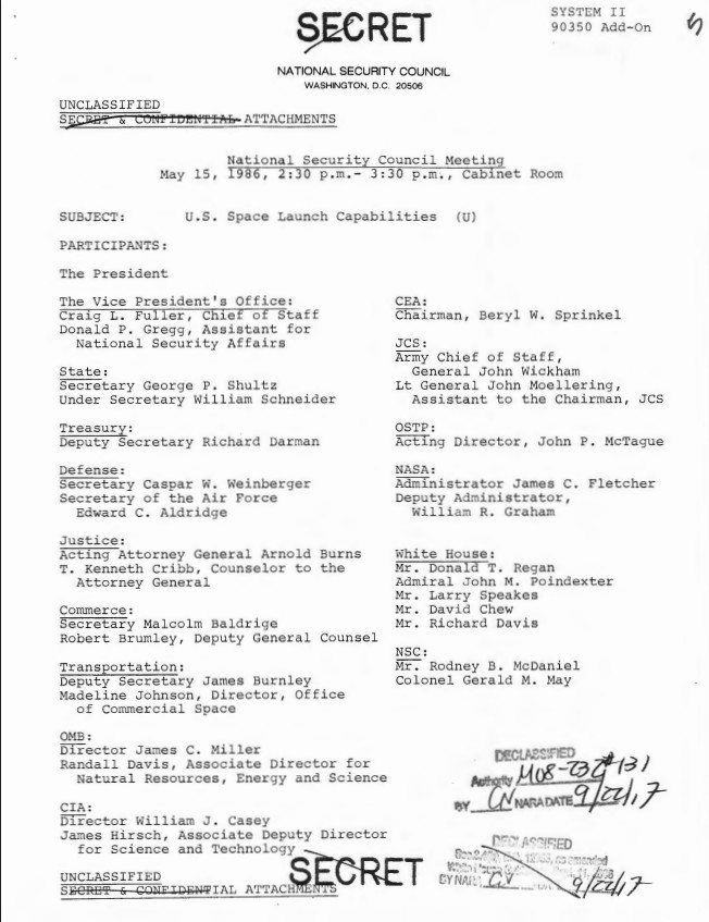 Page 1, National Security Council Meeting May 15, 1986 2:30 p.m. – 3:30 p.m., Cabinet Room Subject: U.S. Space Launch Capabilities Executive Secretariat, NSC: NSC Meeting...Show morePage 1, National Security Council Meeting May 15, 1986 2:30 p.m. – 3:30 p.m., Cabinet Room Subject: U.S. Space Launch Capabilities Executive Secretariat, NSC: NSC Meeting Files: Records. Folder NSC 00131 05/15/1986 (1 of 2) Show less