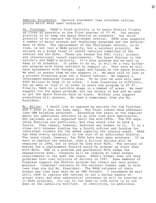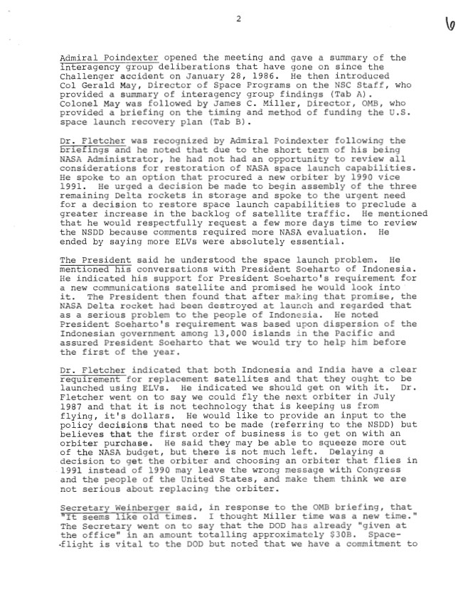 Page 2, National Security Council Meeting July 29, 1986, 11:00 a.m. – 12:00 noon, Cabinet Room Subject: U.S. Space Launch Capabilities Executive Secretariat, NSC: NSC Mee...Show morePage 2, National Security Council Meeting July 29, 1986, 11:00 a.m. – 12:00 noon, Cabinet Room Subject: U.S. Space Launch Capabilities Executive Secretariat, NSC: NSC Meeting Files: Records. Folder NSC 00134 07/29/1986 [Space Launch Capabilities] (1 of 4) Show less
