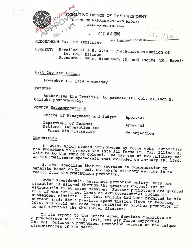 Page 1, Memorandum For The President From: James C. Miller III Subject: Enrolled Bill S. 2948 – Posthumous Promotion of Lt. Col. Ellison Executive Clerk, Office of the: R...Show morePage 1, Memorandum For The President From: James C. Miller III Subject: Enrolled Bill S. 2948 – Posthumous Promotion of Lt. Col. Ellison Executive Clerk, Office of the: Records. Box 80. Folder 11/03/1986 S. 2948 [Posthumous Promotion of Lt. Col. Ellison] Show less