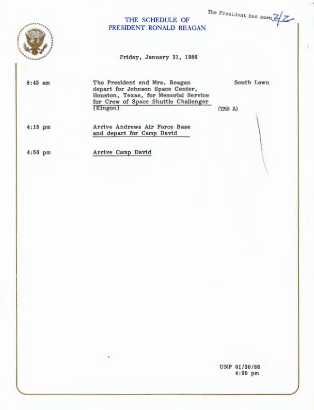 The Schedule of President Ronald Reagan Friday, January 31, 1986 President, Office of the: Presidential Briefing Papers. Box 66. Folder: 01/31/1986 (case file 386631).