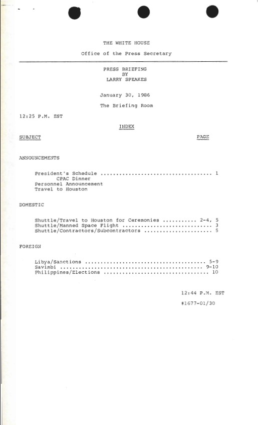 Index, Press Briefing By Larry Speakes 01/30/1986 The Briefing Room 12:25 P.M. EST #1677 Press Secretary, Office of the: Press Releases and Press Briefings: Records SERIE...Show moreIndex, Press Briefing By Larry Speakes 01/30/1986 The Briefing Room 12:25 P.M. EST #1677 Press Secretary, Office of the: Press Releases and Press Briefings: Records SERIES II: PRESS BRIEFINGS. Box 41. Folder: 01/30/1986 (#1677). Show less
