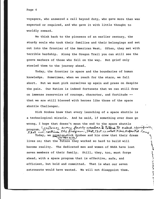 Page 4, Presidential Remarks: Memorial Service For The Challenger Crew Houston, Texas Friday, January 31, 1986, dated: January 30, 1986 2:30 p.m. WHORM: Presidential Hand...Show morePage 4, Presidential Remarks: Memorial Service For The Challenger Crew Houston, Texas Friday, January 31, 1986, dated: January 30, 1986 2:30 p.m. WHORM: Presidential Handwriting File: Speeches. Box 22. Folder 421 (01/29/1986-01/31/1986). Show less