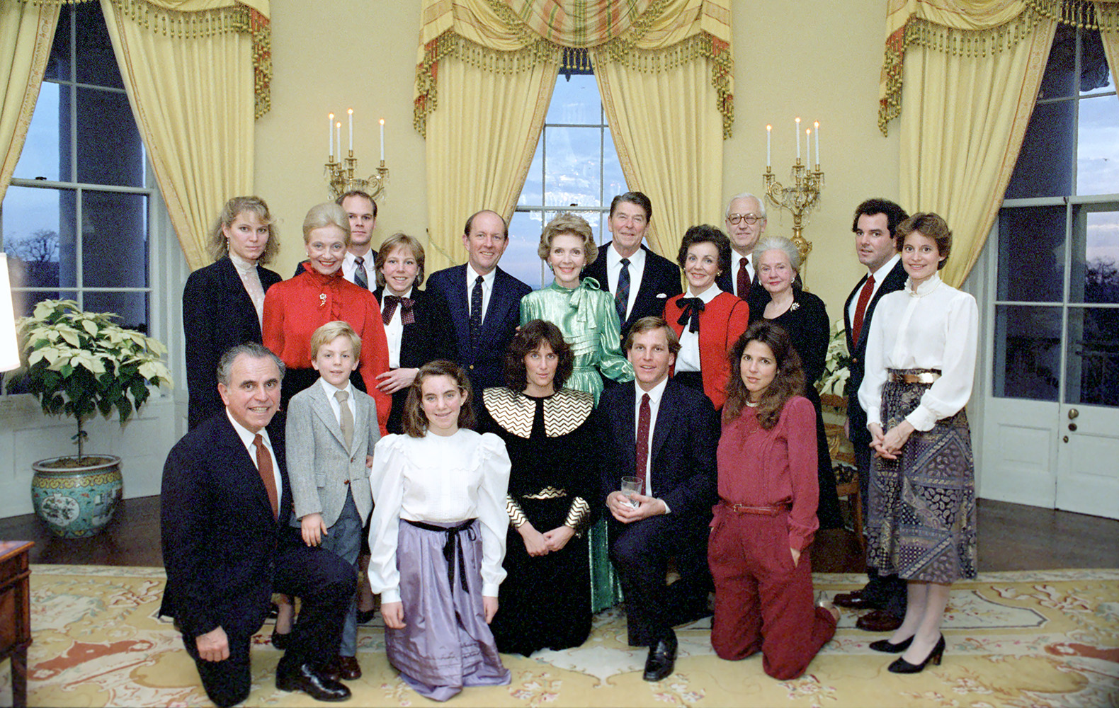 C12114 (03) 12/25/1982 … C12114 (03) … Christmas Party in Residence … Washington, DC … posing for photos … Yellow Oval Room … President Reagan, Nancy Reagan, Patti Davis, Mary Jane Wick, Charles Wick, Daniel Ruge, Greta Ruge, Doug Wick, C.Z. Wick, Kim Wick, Robin Wick, Michael Deaver, Carolyn Deaver, Blair Deaver, Amanda Deaver, Lucy Fisher, Pam Michel … …